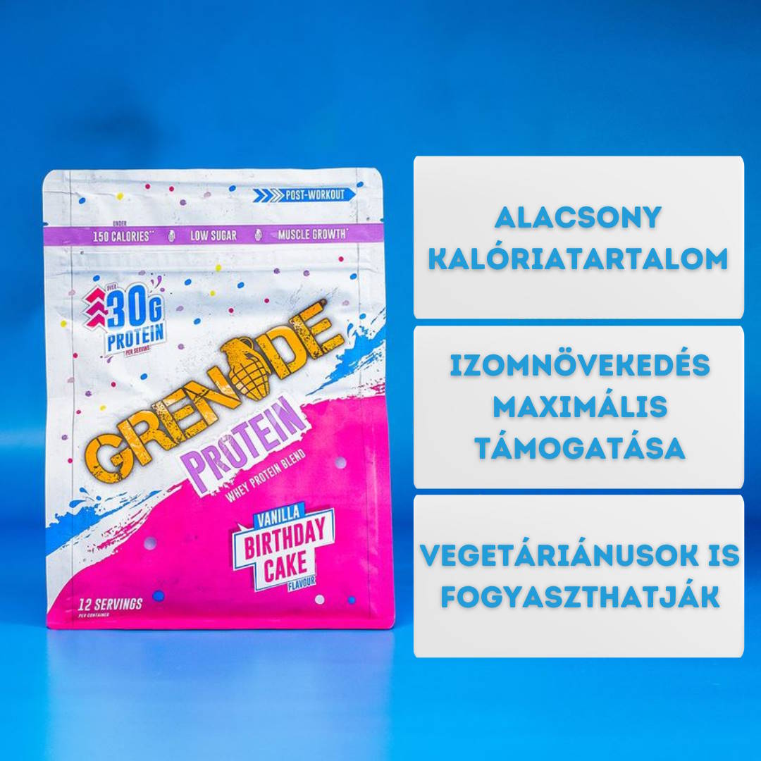 GRENADE PROTEIN WHEY PROTEIN BLEND. Vanilla Birthday Cake. Vanília ízű, tejsavófehérjét (96%) tartalmazó italpor emésztőenzimekkel és édesítőszerekkel. Nettó tömeg: 480 g (12 adag). Felhasználás: 30 g fehérje beviteléhez adjon két teljes adagolókanálnyi port (40 g-ot) 250 ml hideg vízhez vagy bármilyen tejhez, és alaposan keverje össze egy shakerben vagy turmixgépben. Fogyassza edzés után vagy napközben. Összetevők: TEJsavófehérje-koncentrátum, TEJsavófehérje-izolátum, aroma (TEJ), sűrítőanyag: xantángumi; étkezési só, édesítőszerek: aceszulfám-K, szukralóz; DigeZyme® emésztőenzim-keverék: amiláz, proteáz, celluláz, lipáz, laktáz; emulgeálószer: lecitinek. Az allergéneket ld. az összetevők között vastagon kiemelve és aláhúzva. Nyomokban glutént, rákféléket, tojást, halat, szóját, szulfitokat és mustárt tartalmazhat. A csomagolásban elhelyezett szilika tasak fogyasztásra alkalmatlan! Tápértékek 100 g/40 g: Energia: 1569 kJ/371 kcal / 628 kJ/148 kcal • Zsír: 4,4 g/1,8 g • amelyből Telített zsírsavak: 1,4 g/0,6 g • Szénhidrát: 4,8 g/1,9 g • amelyből Cukrok: 3,5 g/1,4 g • Rost: 0,6 g/0 g • Fehérje: 78 g/31 g • Só: 0,96 g/0,38 g. Gyártási sorozatszám és minőségét megőrzi a jelzett hónap végéig: ld. a csomagoláson. Száraz, hűvös helyen tárolandó.