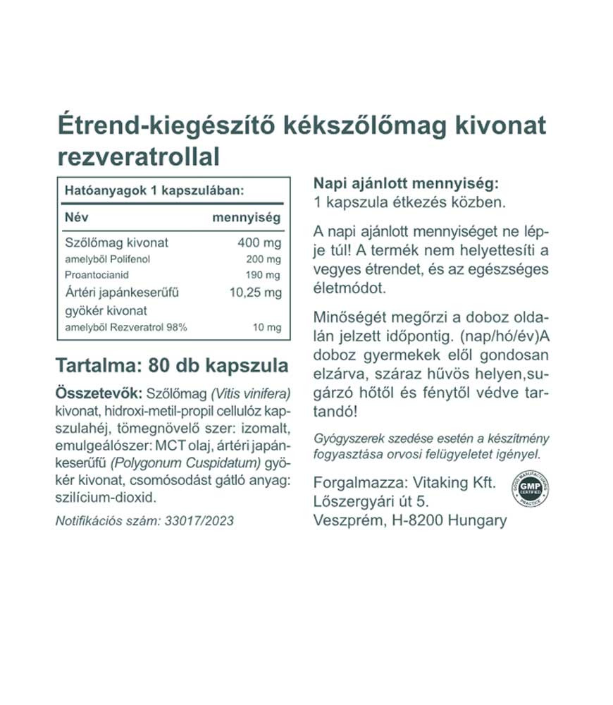Összetevők: szőlőmag kivonat (Vitis vinifera) , hidroxi-metil-propil cellulóz kapszulahéj, tömegnövelő szer: izomalt, emulgeálószer: MCT olaj por, ártéri japánkeserűfű (Polygonum Cuspidatum) gyökér kivonat, csomósodást gátló anyag: szilícium-dioxid