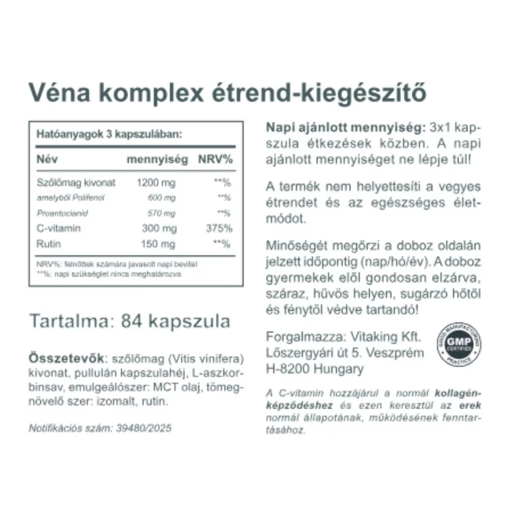 A Vitaking Véna Komplex középpontjában a szőlőmag kivonat áll, amely természetes módon tartalmaz polifenolokat (növényi vegyületek, melyek például ízt és színt adnak a növényeknek) és proantocianidineket (főleg a szőlőben és vörösborban előforduló növényi hatóanyagok). A szőlőmag kivonat hozzájárulhat a vénás keringés támogatásához, segíthet az egészséges erek fenntartásában, és jól ismert antioxidáns forrás.